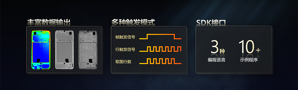 相机对外提供丰富的数据接口,包括轮廓数据、点云数据、深度图、亮度图。同时兼容多种触发模式,支持差分编码器触发输入,支持行触发、帧触发,行+帧触发的应用模式。通过SDK集成激光轮廓传感器到第三方软件框架,提供C、C#、Python三种语言版本的SDK,包括主流视觉分析软件在内的10多种集成使用示例,便于用户的二次开发。